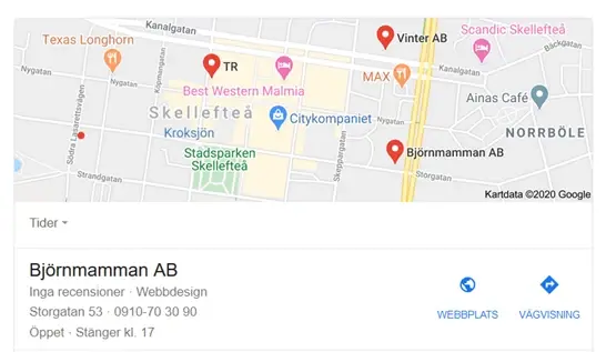 - Var noga med dina NAP-uppgifter. NAP står för name, adress och phone number. Kort och gott handlar det om dina företagsuppgifter. Dessa ska användas konsekvent på alla ställen där de kan förekomma på nätet dvs att du har samma uppgifter överallt. Du kan även med fördel ta med ditt organisationsnummer i dina kontaktuppgifter på t.ex. hemsidan. Vill du vara extra duktig så markera upp kontaktuppgifterna med strukturerad data (schema.org)
